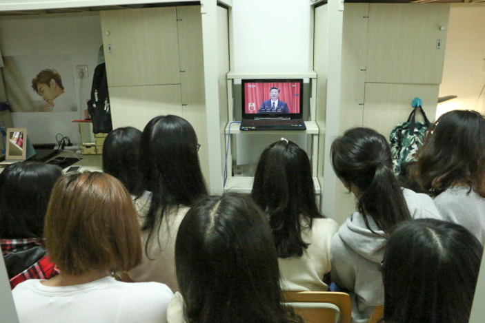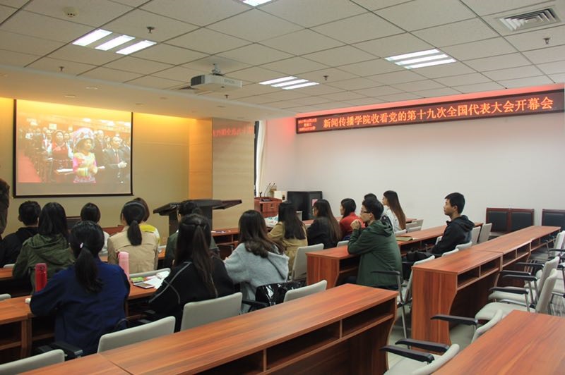 研究生党支部全体在校党员在知新楼A606收看了党的十九次全国代表大会。与会人员认真领悟会议精神,做下笔记,并拿出手机拍照记录。在学习过程中,党员们热烈讨论并发表感言,表示一定会奋发向上,把握时代主题,不忘初心跟党走,将知识与实践相结合,在激情奋斗中绽放自己的青春光芒。此外, 2015级新闻班也组织本科生在中心校区8号楼502寝室和433寝室齐聚,共同观看中国共产党十九次全国代表大会开幕会。同学们通过学习习近平总书记的报告,深刻认识了国家的重大方针和政策,更领悟到五年来经济社会发展给生活学习带来的便利。