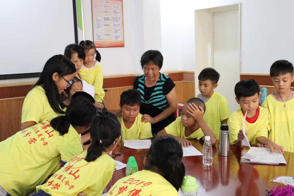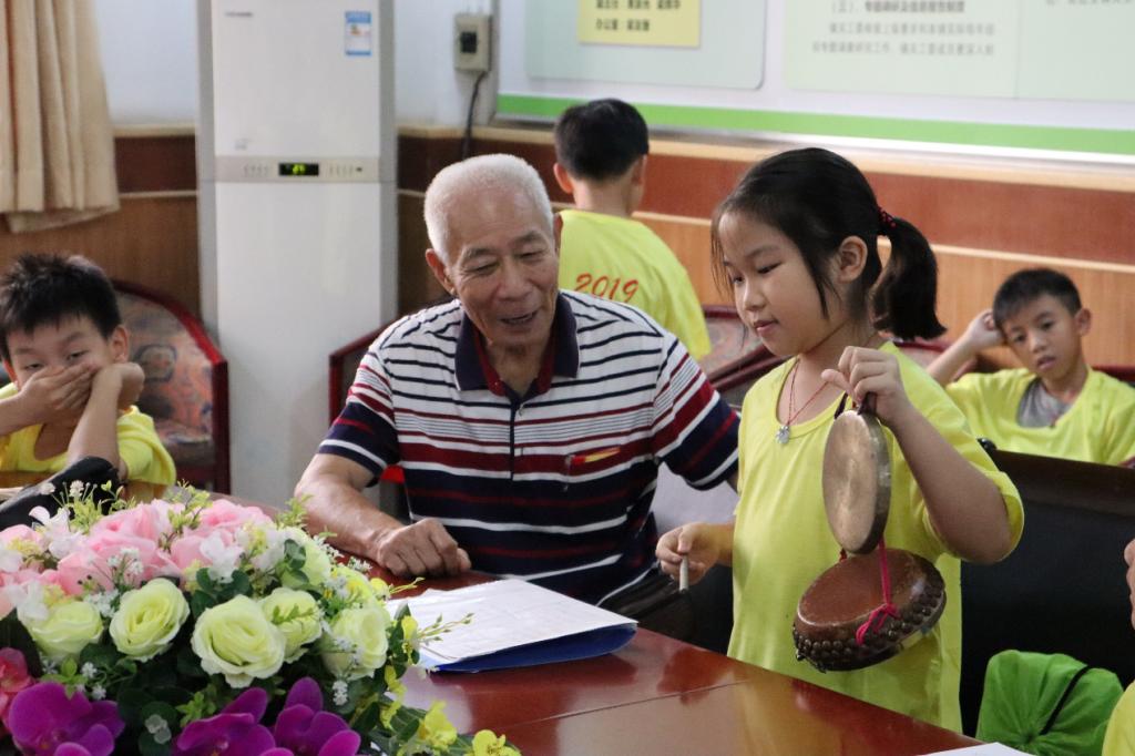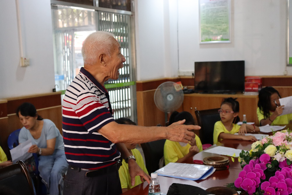 几遍跟唱后,小朋友们逐渐能够完整地唱下全首曲子了,文叔又将小朋友们分成几组,让孩子们进行小竞赛,进一步激发孩子们的学习热情。休息时间,文叔邀请去年就参加过夏令营的两位小朋友进行了龙舟歌演唱,两位小朋友声音稚嫩,但唱法娴熟,让人听到龙舟说唱未来发展的希望。其他两位非遗传承人婆婆也趁着休息的空闲为孩子们演唱了《凿壁偷光》、《愚公移山》等以经典故事改编的龙舟歌曲目,劝谕孩子们勤奋学习、做事不要轻言放弃。第一次听到书上寓言故事以再熟悉不过的顺德音粤语唱出来,孩子们感到新奇好玩,都围在婆婆身边仔细聆听,还不时探头看词,想要提前知道下面的唱句。