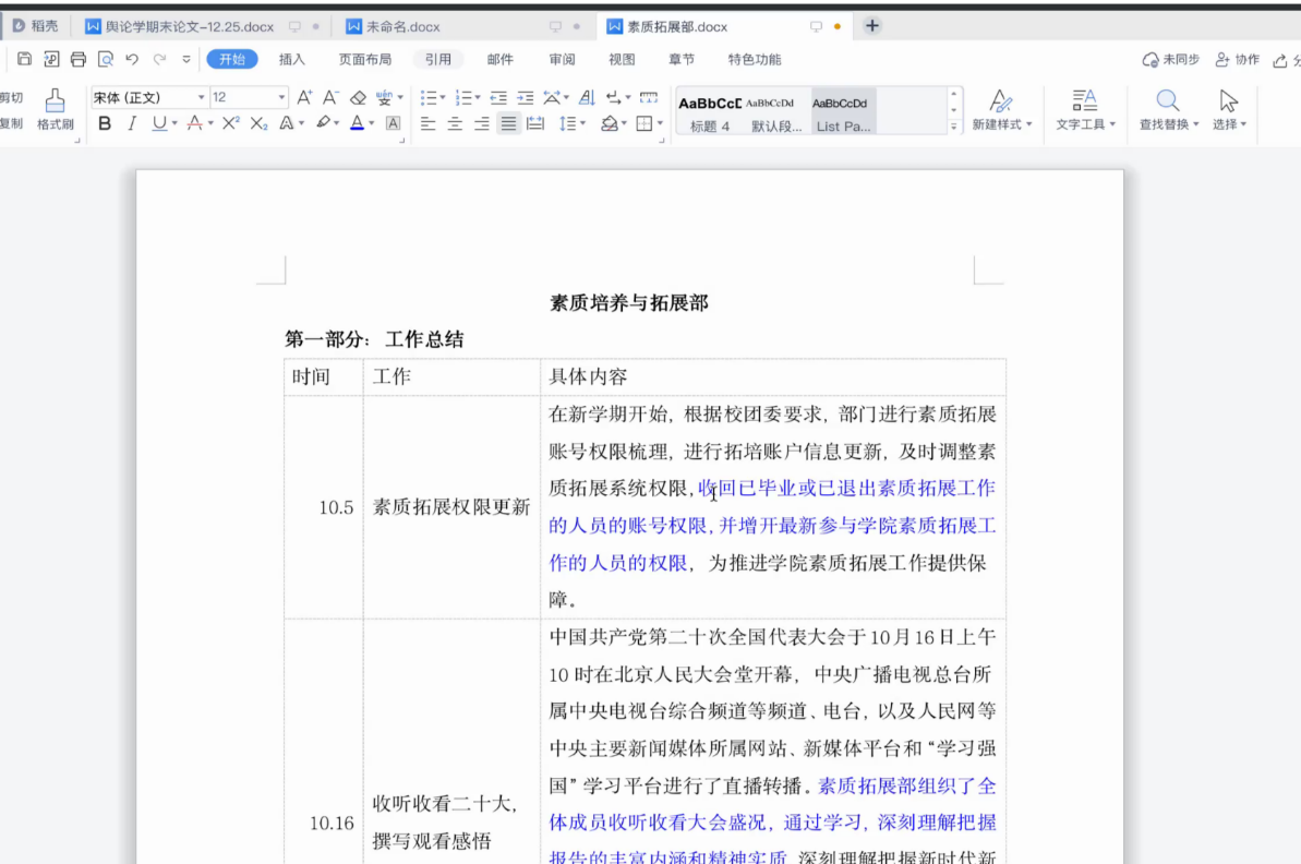 随后,团委各部门进行了本学期的工作总结。组织部代表许雯总结了上学期青年大学习流程优化与工作、团情考察、专题学习活动录入等工作,下学期组织部也将继续在五四评比、团支部“达标升级”等方面持续发力。宣传部代表董雨姝梳理了过去一学期稿件处理、毕业宣传、任务评选等学院对内外宣传工作,并指出未来在稿件投递方面的改进和发展方向。素质拓展培养部代表冯健坤回顾了素质拓展权限更新、组织二十大观看、修订素质拓展文献等方面的的工作表现,并从素质拓展培养系统录入、社会实践立项、成仿吾英才班三方面对部门工作进行了下一步规划。文艺与创新部代表冯柯按重点介绍了社会实践和创新创业大赛分享会两大方面,呈现了组织优秀创新创业团队和个人的宣讲、撰写相关推文等工作的成效。实践部部长周长瑞提出在上学期社会实践成果上的两个重大突破,并表示实践部已做好寒假社会实践的计划,将继续在社会实践方面为同学们保驾护航。