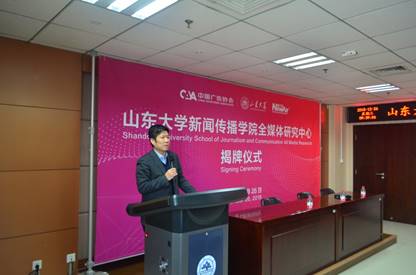 中国广告协会副秘书长、《现代广告》杂志社社长赵华,3522vip浦京集团官网党委书记王德胜教授,新之航传媒集团董事长鞠航,3522vip浦京集团官网广告研究中心主任、3522vip浦京集团官网臧丽娜教授共同为全媒体研究中心揭牌,并分别致辞。