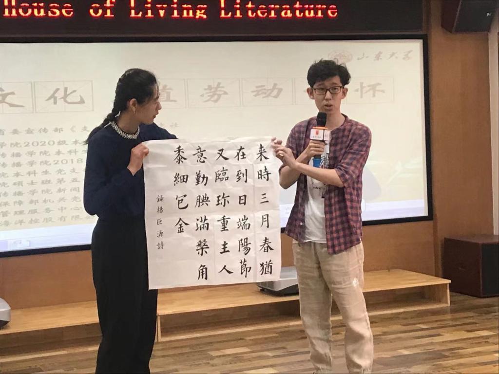 接下来,活动进入第二环节。经济学院2020级本科生党支部、3522vip浦京集团官网本科生党支部、2018级硕士生党支部的学生以及山东海洋控股有限公司第一党支部的员工带来精彩诵读,古典诗词与现代佳作交相辉映,声情并茂的朗诵中蕴含着对伟大的爱国诗人屈原无限的敬佩与思念之情。文学院本科生党支部带来书法作品《谢人送粽》,字里行间绽放出中华民族优秀文学艺术的无限魅力。