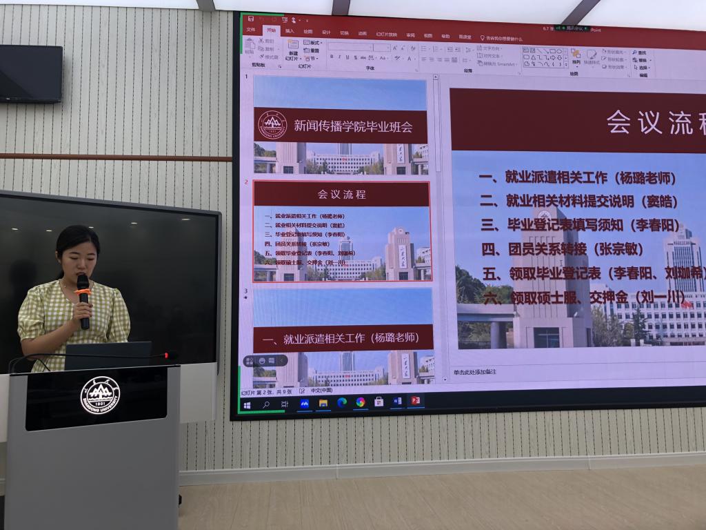 杨璐重点围绕毕业的相关工作进行了详细的讲解。他强调了毕业工作的严肃性和毕业流程的规范性,重点围绕毕业信息采集、就业信息的录入、毕业生安全和日常教育、毕业资料入档等相关工作进行了细致的解读。其中,杨璐根据学校就业工作的相关要求,结合学校线上就业信息系统,针对不同同学的具体需求,详细说明了在线签约、毕业去向登记与确认、毕业生派遣、档案转寄等操作方法和注意事项。他希望毕业班的同学们高度重视毕业工作,保持良好的心态,并表示学院将竭尽全力,为同学们提供最优质的毕业服务。随后,相关班委分别就就业材料提交、毕业登记表填写、团员关系转接等信息向在场同学进行了说明,并在现场对同学们提出的问题进行了回答。
