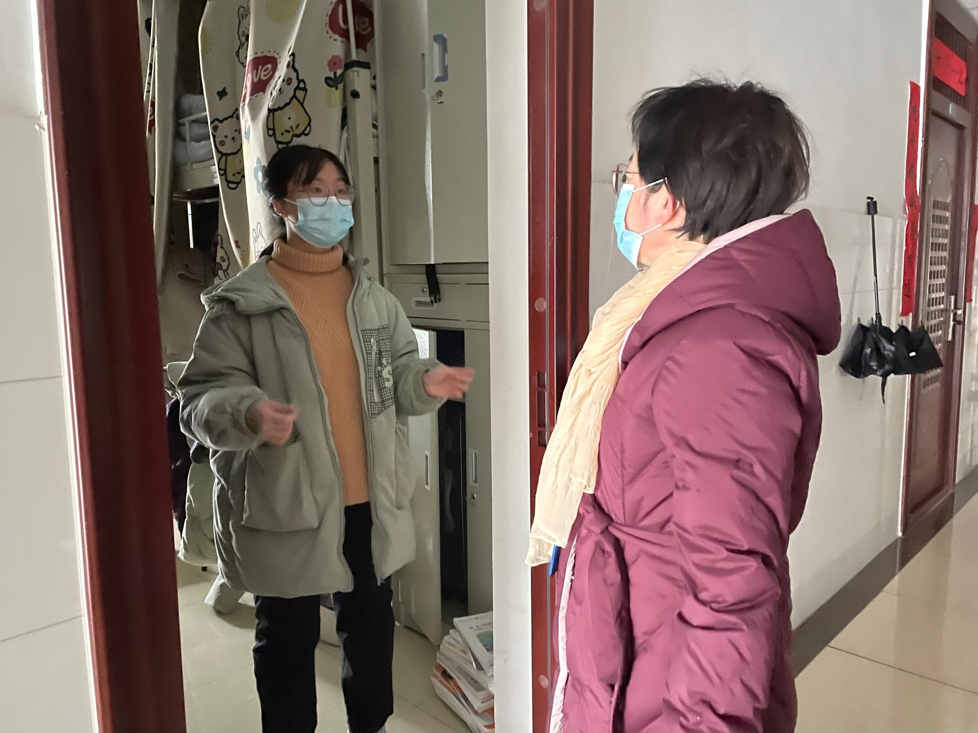 离开教室后,她们走进本科生、研究生学生宿舍,了解学生的生活状况,详细询问学生生活学习遇到的困难并提出了积极的建议。同时进一步叮嘱同学们要严格遵守学校的疫情防控规定,及时按要求做好核酸检测,“线上+线下”的学习模式中努力学习专业知识,调整好心态和作息。