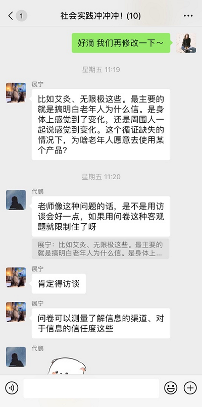8月2日,受突发疫情影响,团队成员紧急召开了第二次线上会议。由于疫情形势发生变化,成员们首先在问卷发放方式上达成共识,决定采用线上滚雪球的方式进行问卷发放的收尾工作。而针对后续的实践,团队将考虑疫情因素对研究问题与实践的影响,酌情增加线上时间项目,例如对调研结果进行数据可视化展现,通过线上访谈、音频录制、海报设计等形式加强健康知识的科普,提高老年人的健康意识与真假信息辨别能力。