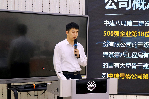 宣讲环节,企业人力资源部业务经理刘武达向同学们介绍了中建八局第二建设有限公司的基本情况,包括中建体系的构成、公司组织架构、全面且优质发展的业务板块、高营业收入的品牌实力、入职志愿分配原则,并结合自身经历阐述了公司由“铁军文化”与“齐鲁文化”构成的严谨但具有亲和力的企业文化。此外,刘武达还介绍了公司的发展战略,并从薪酬福利、培训体系、职业发展、事业伙伴与工作生活福利等方面介绍了员工发展政策。
