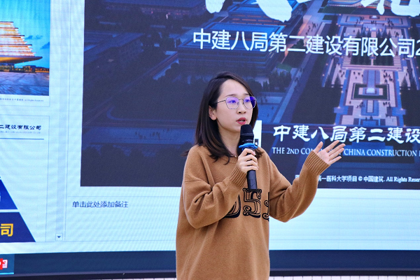 随后,党委工作部部长、团委书记刘敏,结合自身入职经历,向大家讲解了本次专场活动开放的党建岗位的职能与职责。刘敏首先介绍了党委工作部门的员工构成,并简单讲述了招聘岗位对应的具体工作,然后结合当下党群建设人才的市场需求与公司内部的晋升路径,总结了选择这一岗位的优势,并从公司提供的广阔平台、央企的影响力与完备的培训体系等方面,说明选择中建八局第二建设有限公司的有益之处。
