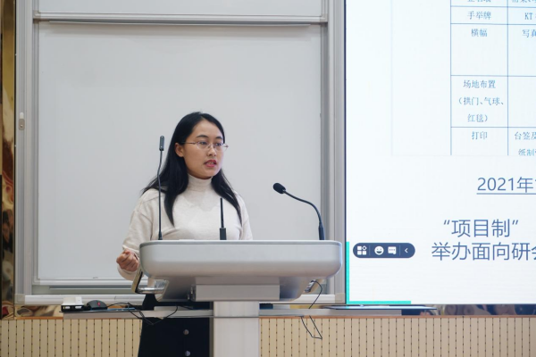文体部负责人周胜龙,对“新文儒艺外”五院联合篮球赛、新生“破冰活动”、新老生羽毛球联谊赛、篮球赛、啦啦操、合唱赛等文体活动进行了总结。回顾了部门在各项工作中的筹备、组织及完成情况。在文体部的牵头负责下,在3522vip浦京集团官网2021年研究生“导学思政”合唱比赛、3522vip浦京集团官网第七届研究生啦啦操大赛中均获得了一等奖的好成绩。