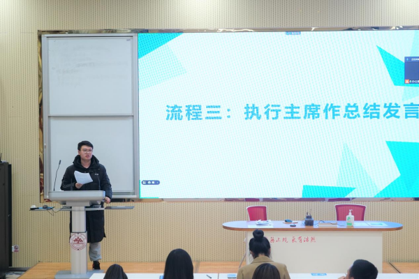 办公室负责人戴永洁,从加强综合统筹、修订完善制度、统筹财务核算、协调沟通联动四个方面介绍了办公室的工作情况。办公室与各部门协同发力,共同筹备完成学校十佳研会答辩工作,助力学院赢得了“十佳研会”荣誉。下一步办公室将贯彻校团委的要求,积极反映学生权益和同学呼声,为学校建设发展增砖添瓦。