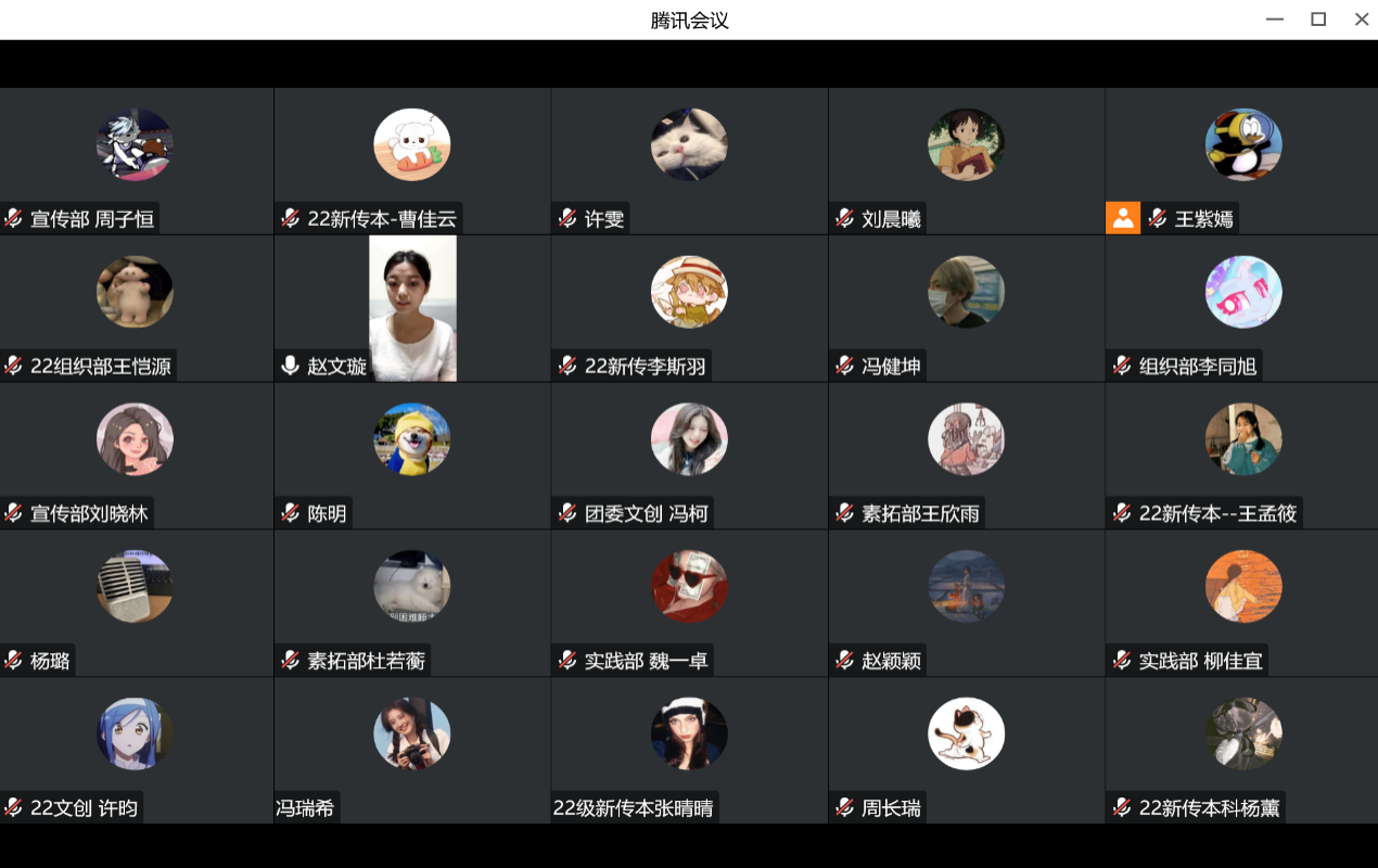 12月18日,3522vip浦京集团官网团委召开2022年度总结大会,学院团委书记杨璐、副书记刘晨曦、创新创业中心主席赵文璇,团委各部门部长、委员以及各团支部书记参会。会议采取线上形式,由组织部王恺源同学主持。