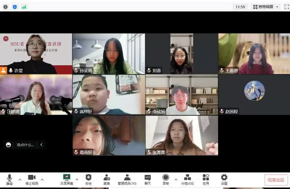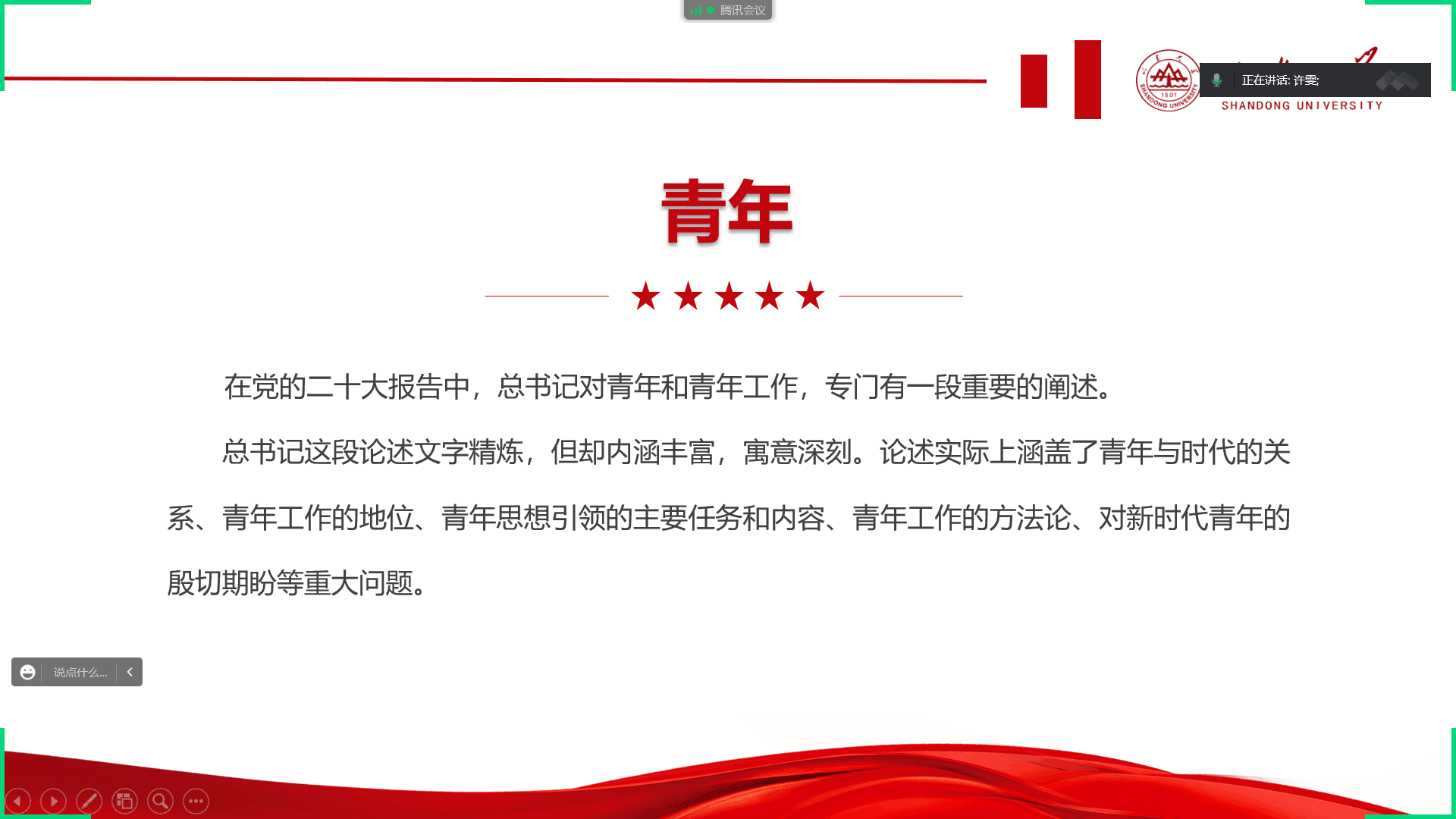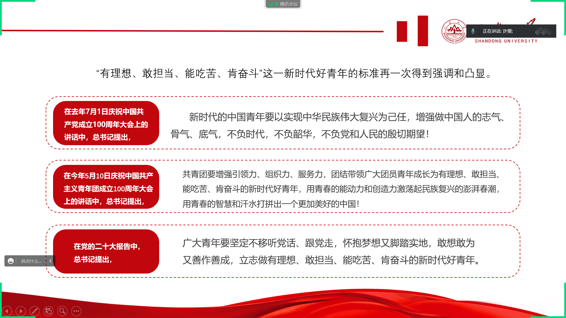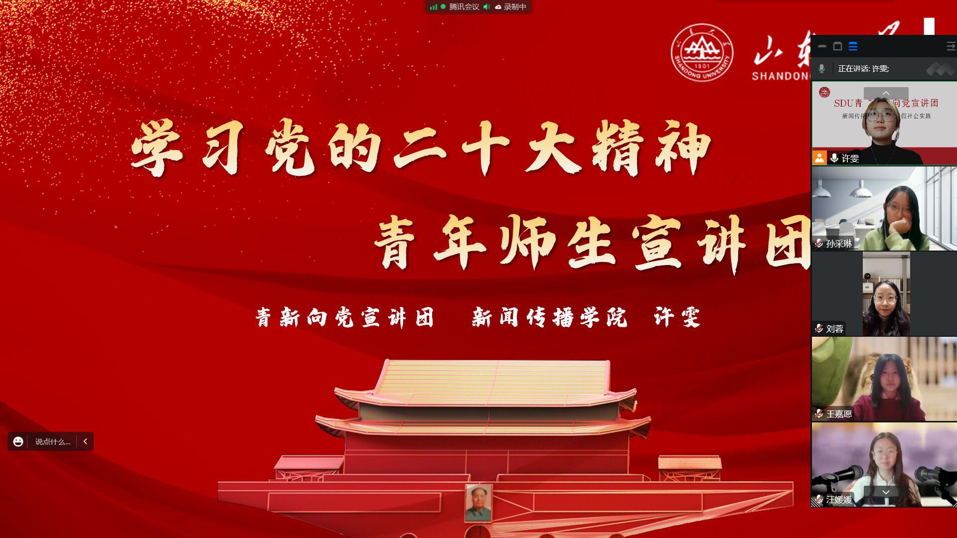 为进一步深入学习宣传贯彻党的二十大精神,让青年们在学习中砥砺初心使命,汲取奋进力量,1月16日晚上,3522vip浦京集团官网“青新向党”学生宣讲团成员许雯,通过腾讯会议的方式,在山东威海向山东临沂支教团队进行宣讲。此次宣讲以“奋斗新时代,青春正当时”为主题,许雯结合党的二十大报告中有关青年的内容,围绕新时代新思想、新成都新实践,讲述新青年新奋斗的生动故事。