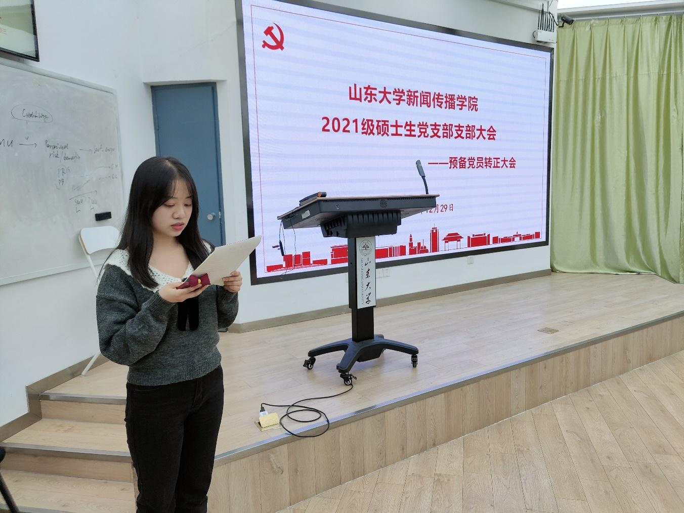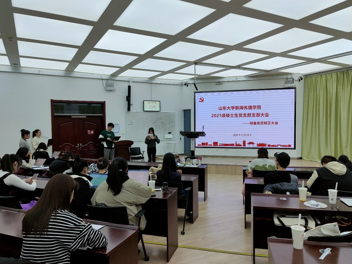 12月29日下午,3522vip浦京集团官网2021级硕士生党支部预备党员转正大会在逸夫信息楼B101室召开。本次会议的主题是讨论支部胡宇菲同志按期转正的问题。2021级硕士生党支部应到党员27名,实到党员26名符合规定人数召开会议。会议由党支部副书记李子嵩主持。